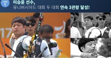 코오롱 엑스텐보이즈 이승윤 선수가 8월 24일 열린 2017 타이페이 하계유니버시아드 대회 리커브 종목별 결승에서 남자 단체전과 혼성전에 이어 개인전까지 금메달을 거머쥐며 대회 3관왕을 달성했습니다. 또한, 2015 광주 하계유니버시아드 대회에 이어 두 대회 연속 3관왕이라는 대기록을 달성한 것이기도 합니다.